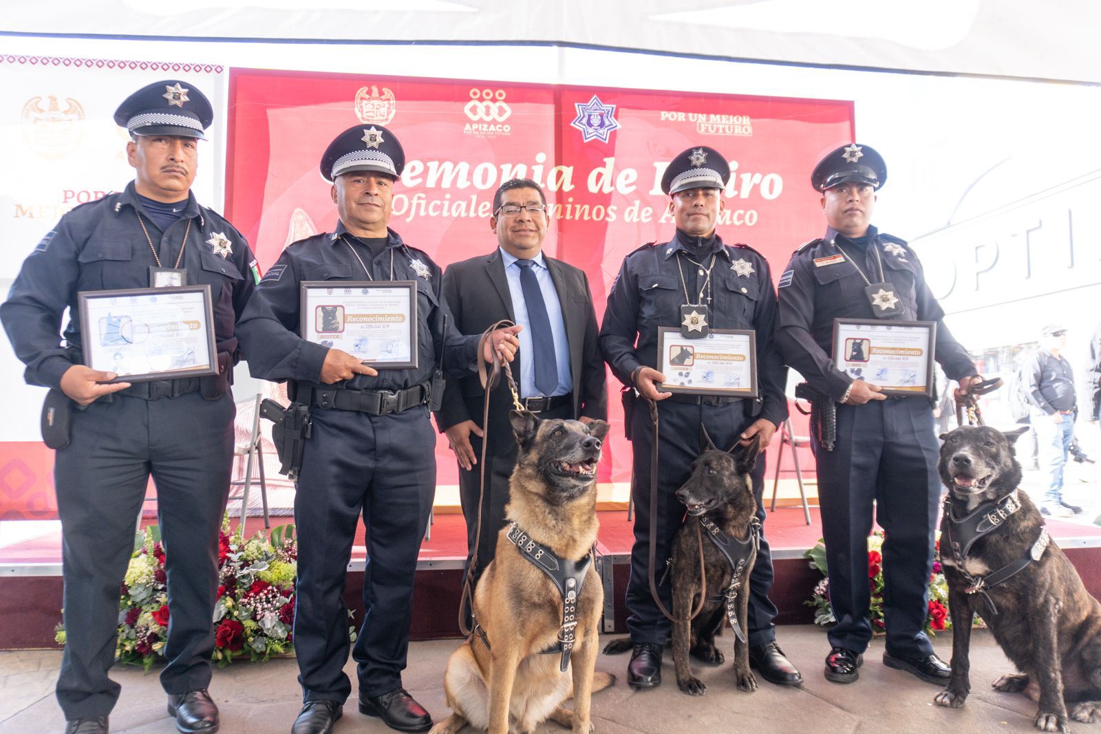 Por iniciativa de Arnulfo Alva, ‘El Che’, presidente de la Comisión de Seguridad Pública de Apizaco, Rex, Boster y Luger, oficiales caninos, se jubilaron tras 7 años de servicio dentro de la corporación municipal, en una emotiva ceremonia donde también fue recordado Airón, quien perdió la vida.